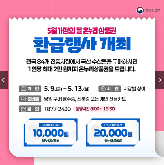 다가오는 5월, 전통시장에서 신선한 국산 수산물을 더 저렴하게 구매할 수 있는 기회가 찾아옵니다. 해양수산부는 5월 9일부터 13일까지 전국 전통시장에서 국산 수산물 구매 시 최대 30%를 온누리상품권으로 환급해주는 행사를 진행합니다. 가정의 식탁을 풍성하게 하고 전통시장도 살릴 수 있는 이번 기회를 놓치지 마세요!