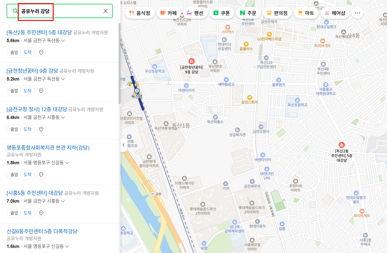 검색시 "공유누리 (장소)" 라고 하면 주변의 공유누리 장소들 목록이 나옵니다.